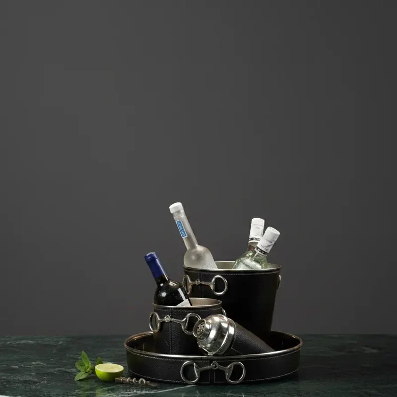 Make every pour an indulgence with the Daamaira Equine Bar Set. This premium 4-piece set includes an oval serving tray, two ice buckets, and a shaker — all handcrafted in supple ebony leather with polished silver equestrian-inspired accents. Designed to impress, it brings timeless charm and functionality to your gatherings, echoing the heritage and refinement of fine entertaining.