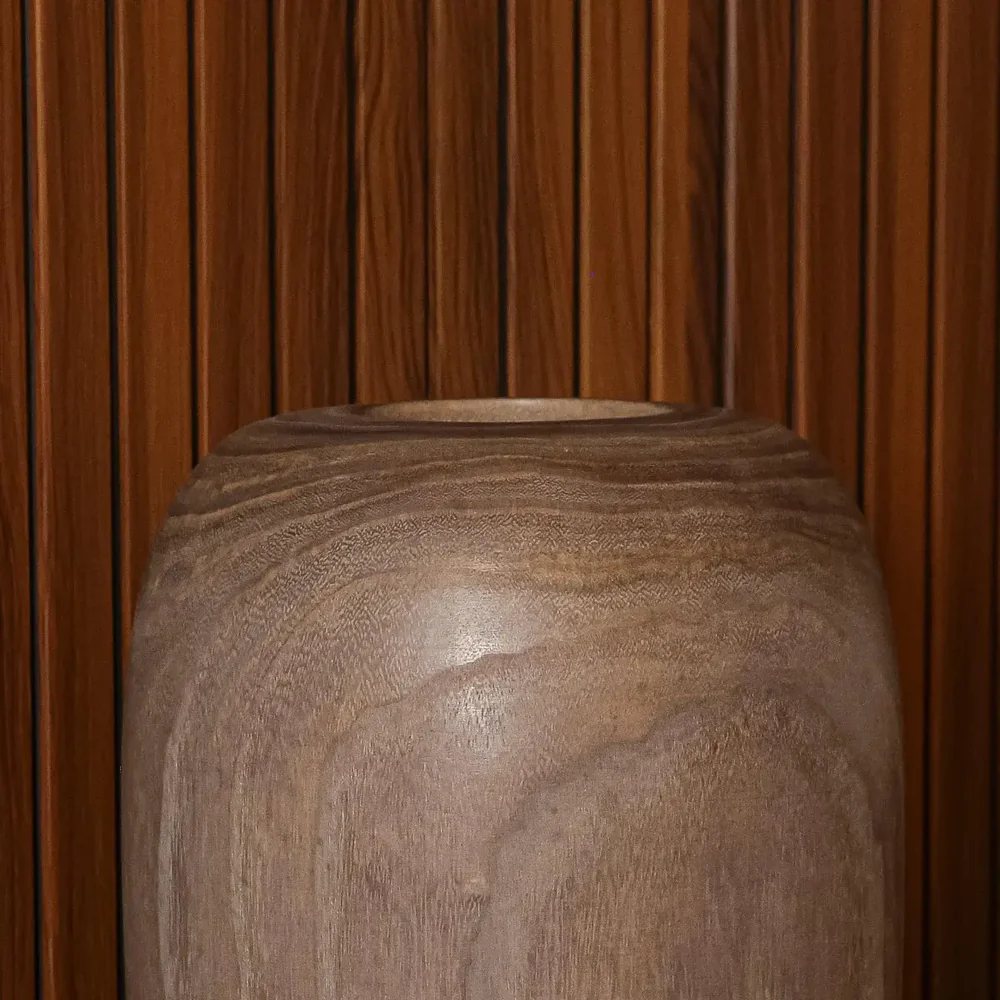 This luxury decorative vase is ideal for both fresh flowers and dried botanicals. Place delicate stems, pampas grass, or artistic branches inside to create a serene, nature-inspired arrangement. Its broad, stable base ensures it sits confidently on centre tables, consoles, or sideboards. The wooden material gives it a grounded presence, making it a timeless piece in any room.